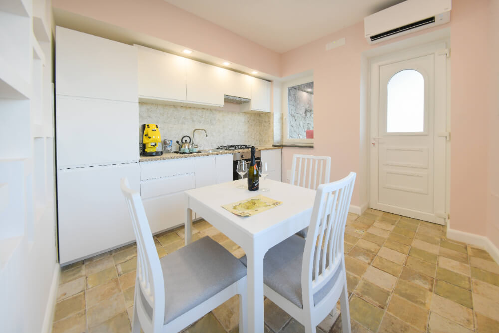 The fully equipped kitchen, complete with stovetop, oven, refrigerator, and kitchenware, allows you to enjoy full independence throughout your stay.
